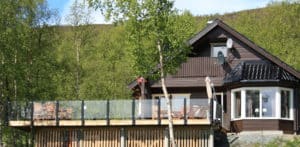 En ny terrasse som bygges med fint gulv og et eksklusivt glassrekkverk som slipper inn lyset og omgivelsene.