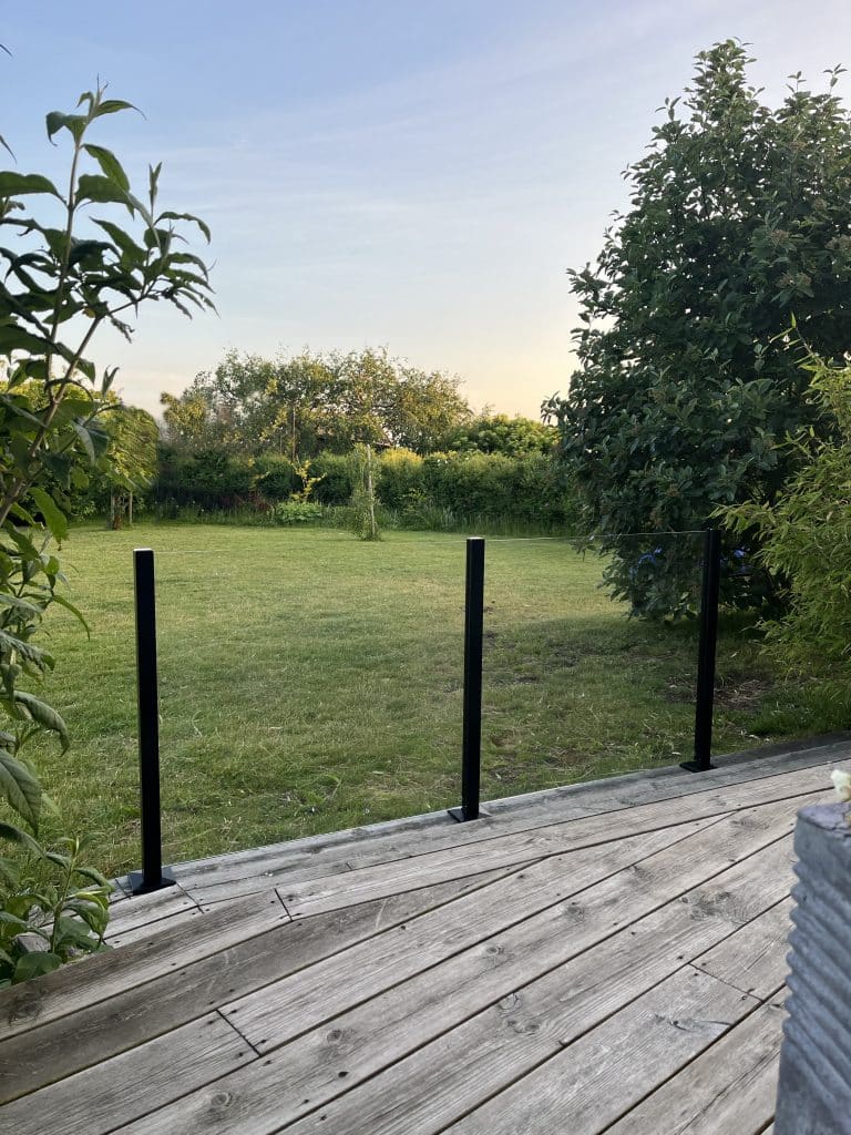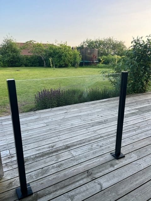 Vår avgrenser med glass bestilles i deler med faste mål, mens øvrige glassrekkverk tilpasses på millimeteren ut fra ditt underlag. Vår avgreser med glass er ikke et sikkerhetsprodukt, slik våre andre glassrekkverk er. Fremfor alt er dette viktig å tenke på ved montering ved fallhøyde. Vår avgrenser med glass er med herdet glass, mens våre øvrige glassrekkverk alltid har laminert glass, noe som gjør at glasset sitter sammen selv om det blir skadet.