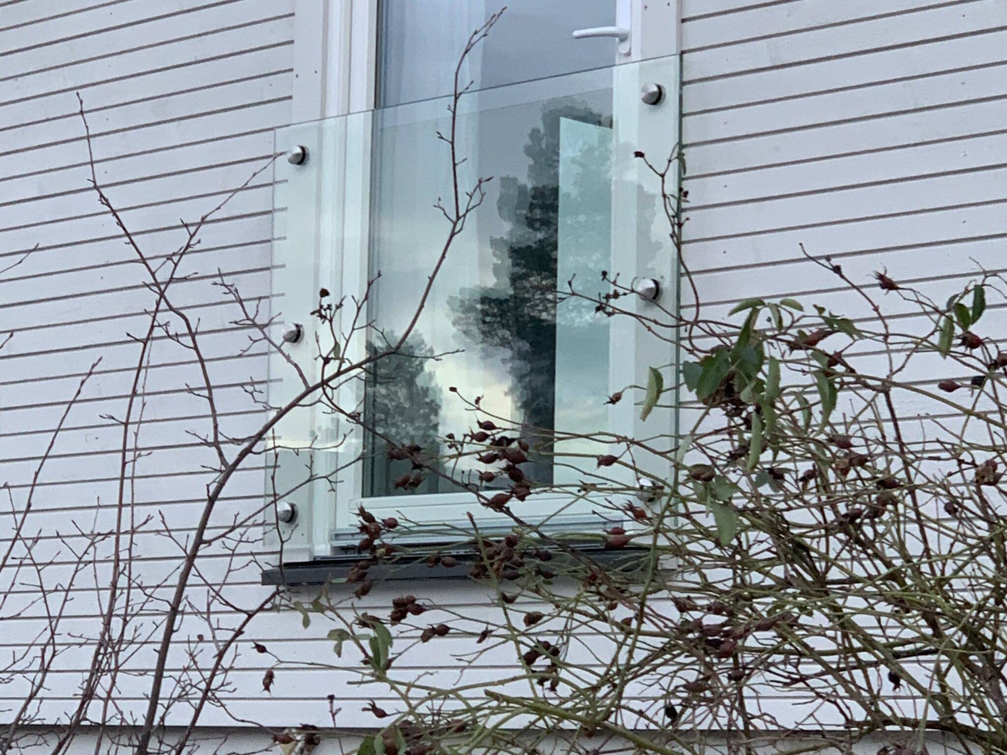 - Montering med aluminiumsstolper – Diskrete stolper i naturanodisert aluminium, hvit, svart eller grå med struktur. Også her er glasset forboret for maksimal sikkerhet.