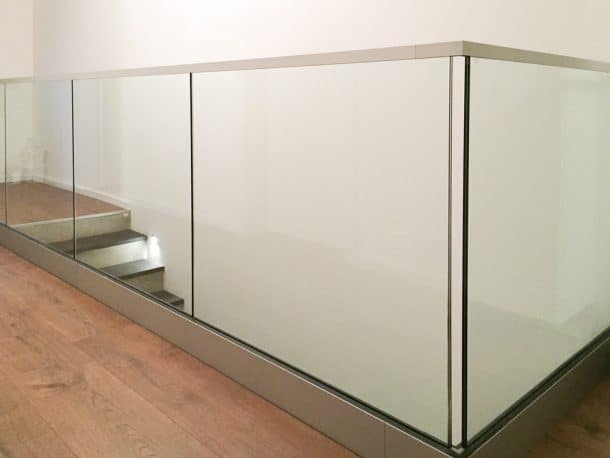 • Aluminiumskinne: Glasset festes til én enkelt skinne som plasseres enten utenpå eller ovenpå underlaget.